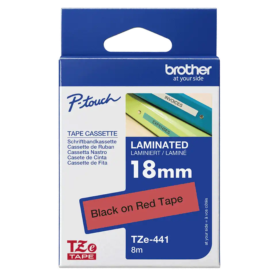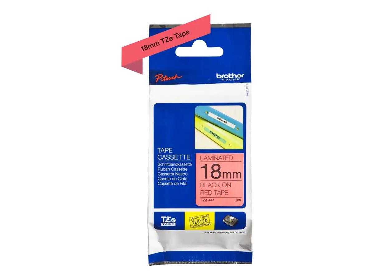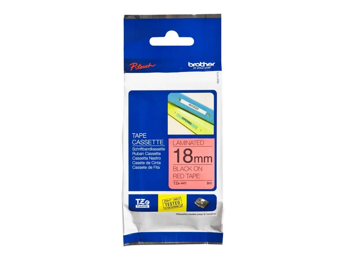 TZe-441 - Standard-Klebstoff - schwarz auf rot - Rolle (1,8 cm x 8 m) 1 Kassette(n) laminiertes Band - für Brother P-Touch Cube Plus PT-P710BT, PT-P710BTH; P-Touch EDGE PT-P750WVP and P-Touch