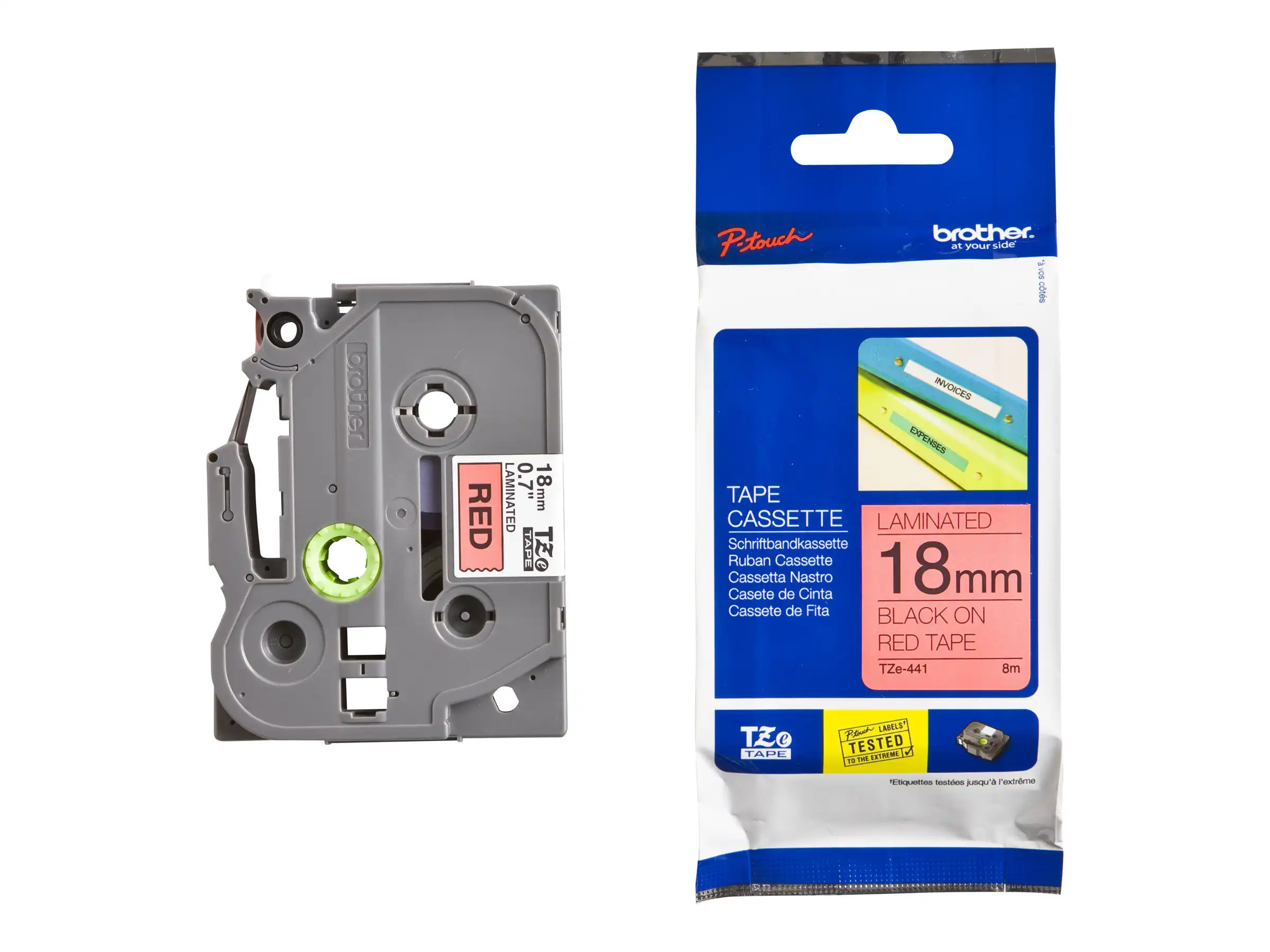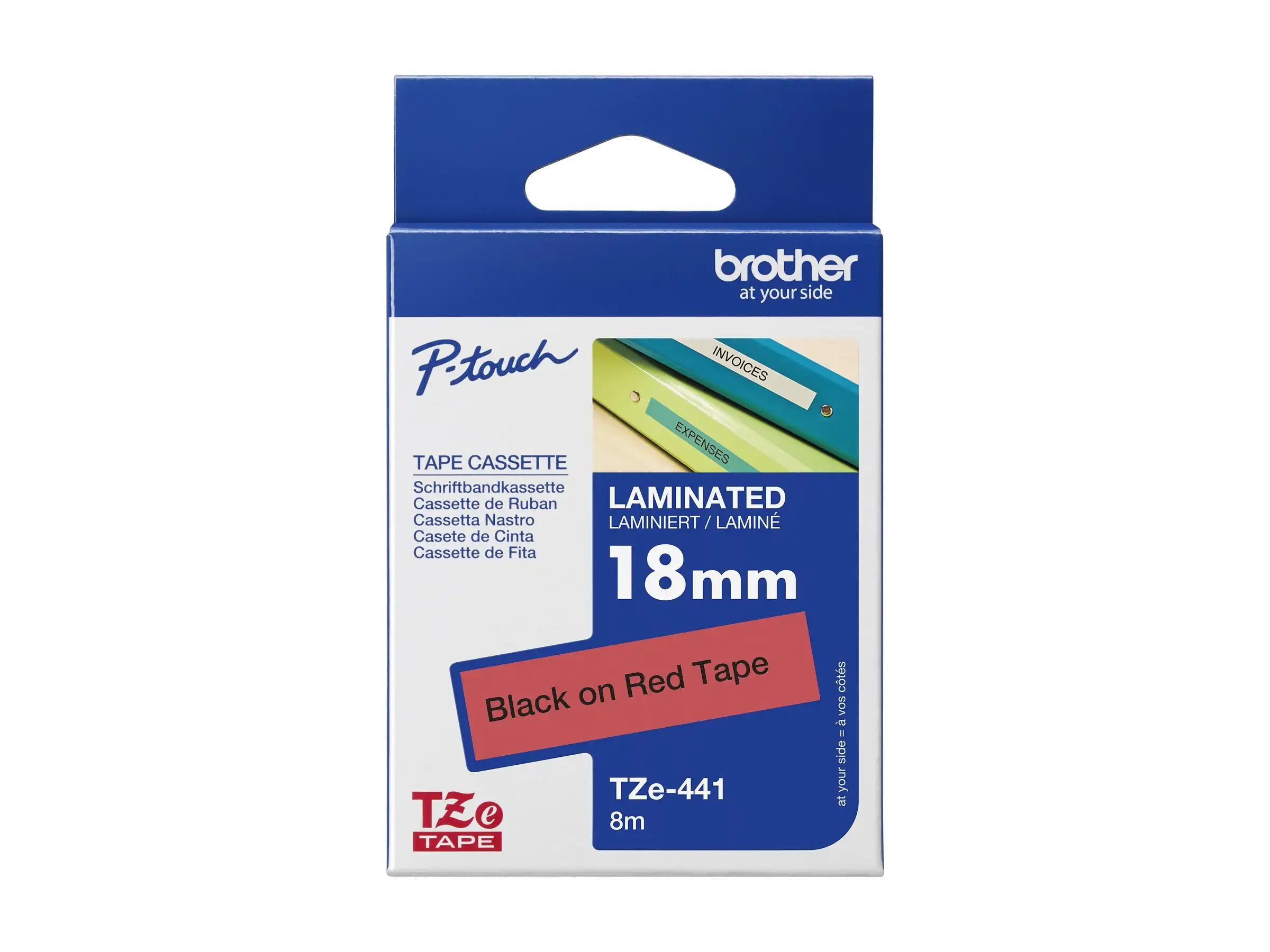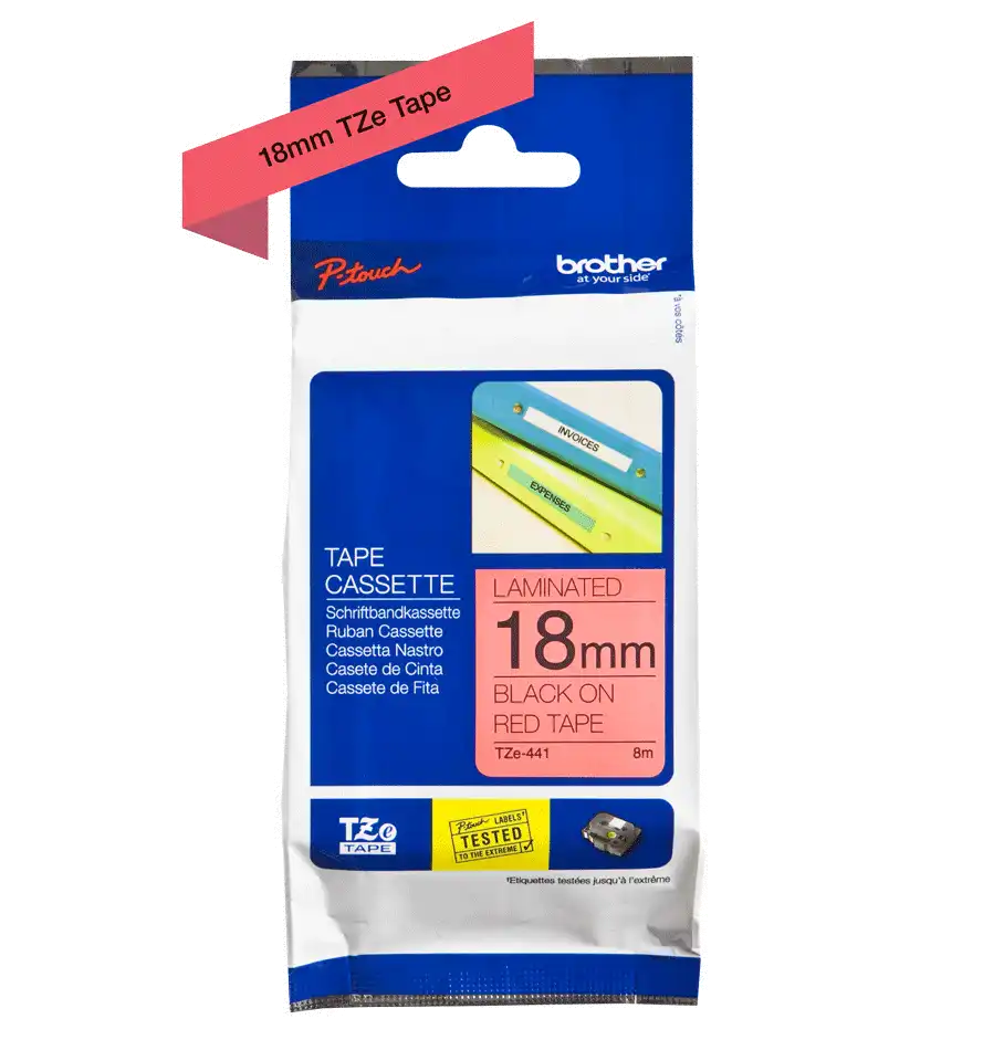 TZe-441 - Standard-Klebstoff - schwarz auf rot - Rolle (1,8 cm x 8 m) 1 Kassette(n) laminiertes Band - für Brother P-Touch Cube Plus PT-P710BT, PT-P710BTH; P-Touch EDGE PT-P750WVP and P-Touch
